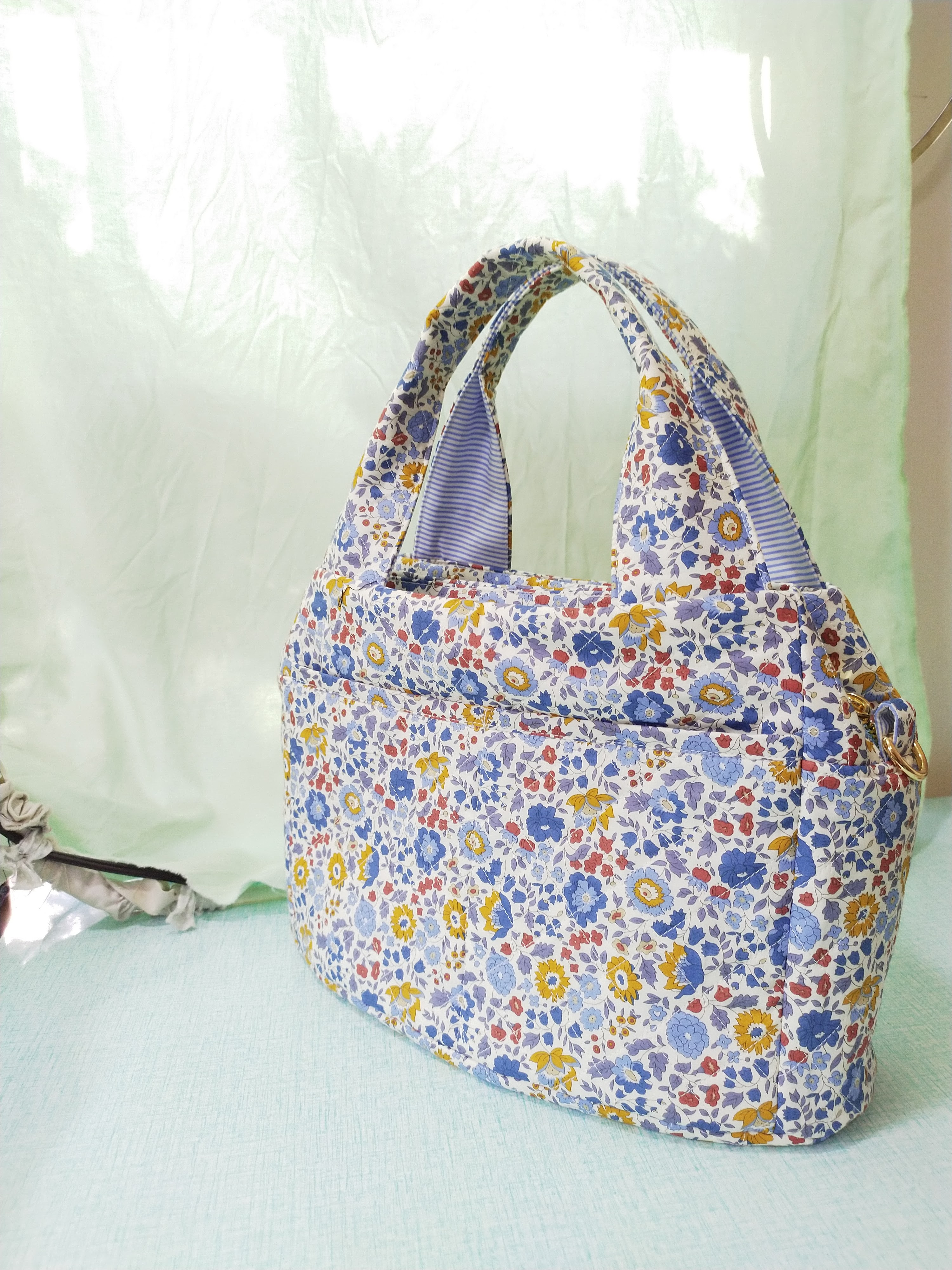 我們談了一下, 設計師說可以車看看嗎? 我當時已經有在車化妝包和鉛筆盒. 所以她就委託我先做個單層簡單的化妝包. 車是沒問題, 但材料只有面料liberty. 和薄的裡布用料